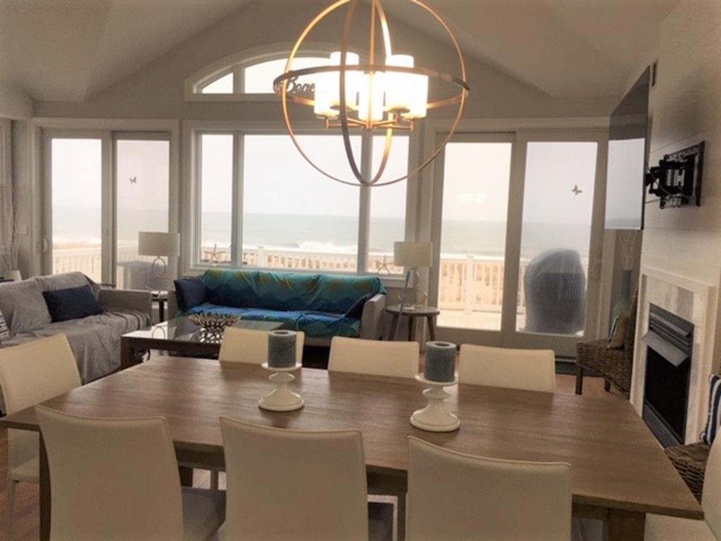 Beautiful oceanfront with fantastic views in prestigious Harvey Cedars . Newer kitchen with marble counters and brand new bath on the main level. View the ocean from the open concept kitchen dining and living area that spills out onto the large deck . Enjoy the sandy white wide beach at your doorstep and the bay just a short walk for crabbing and fishing, close to shops in town. Great family location on a quiet street. 2 outside showers. . There are 2 single roll away beds to use where needed. Linens are provided for sofa bed, 2 single roll away and bunks only and must be left clean for next tenant. Tenant must supply linens for King bed and 2 queen beds . Pillows and blankets are provided. Washer is standard NOT HE. No pets are permitted . 8 Beach passes offered. There is a 2nd fridge in garage and retractable awning on the deck.