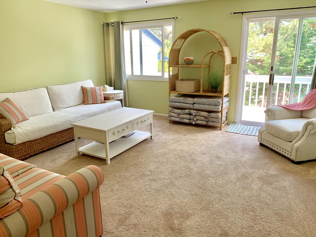 Immaculate townhouse located in the Ocean Club in Brant Beach. Queen bedroom and full bath on the first floor, up a few steps you will find a updated eat in kitchen, a few more steps is the large living room with sliders to a deck and roof top deck. A few steps more there is a queen bedroom with a set of bunk beds and a bathroom with shower. This is a corner unit, gas grill , community pool, and easy walk to the beach from the gate in the back. Parking for 2 cars only. Owner provides pillows and blankets for tenant use.