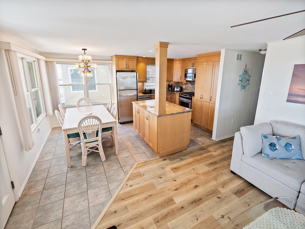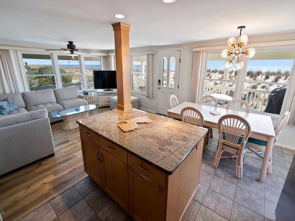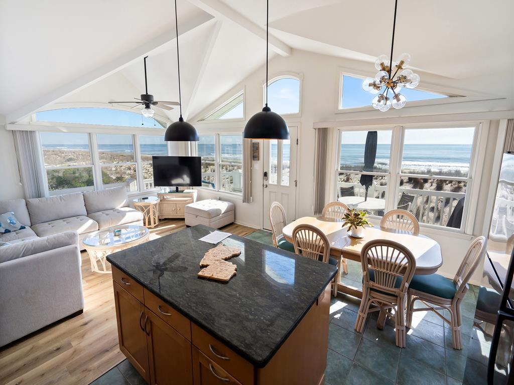 Newly updated 1st floor ocean front 3 bedroom Tastefully decorated and well kept. Ocean & beach views.. Enjoy your morning coffee or evening cocktails on the large deck off the main living area. Ground level has a shared lounge space that is stoned and has 4 Adirondack chairs, small tables and located on the north side of the house, closest to the beach entrance. New in 2024 chaise lounge chairs on deck. Some beach chairs and an umbrella in \"as-is\" condition and are shared with 2nd fl tenants. First come first serve . No cable- streaming only with Roku and You Tube TV