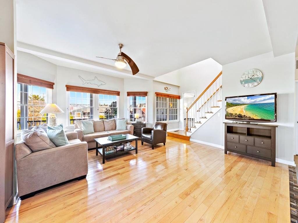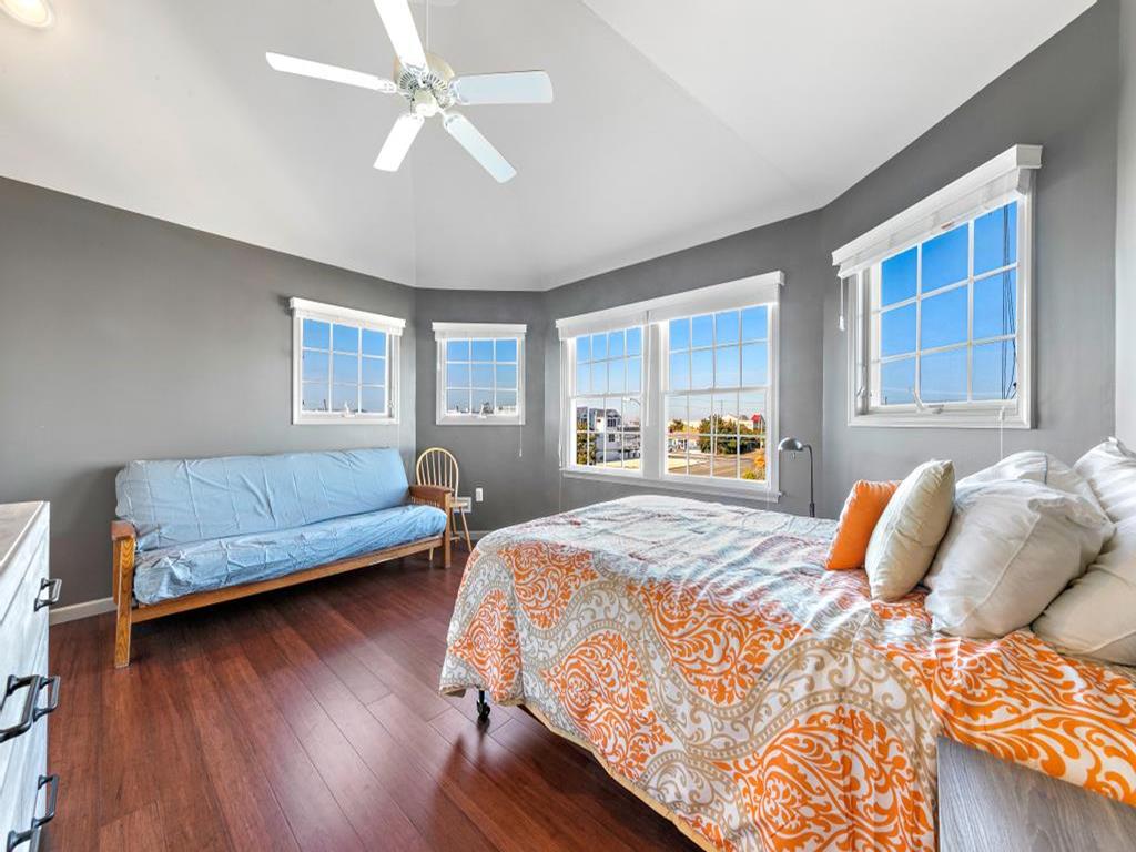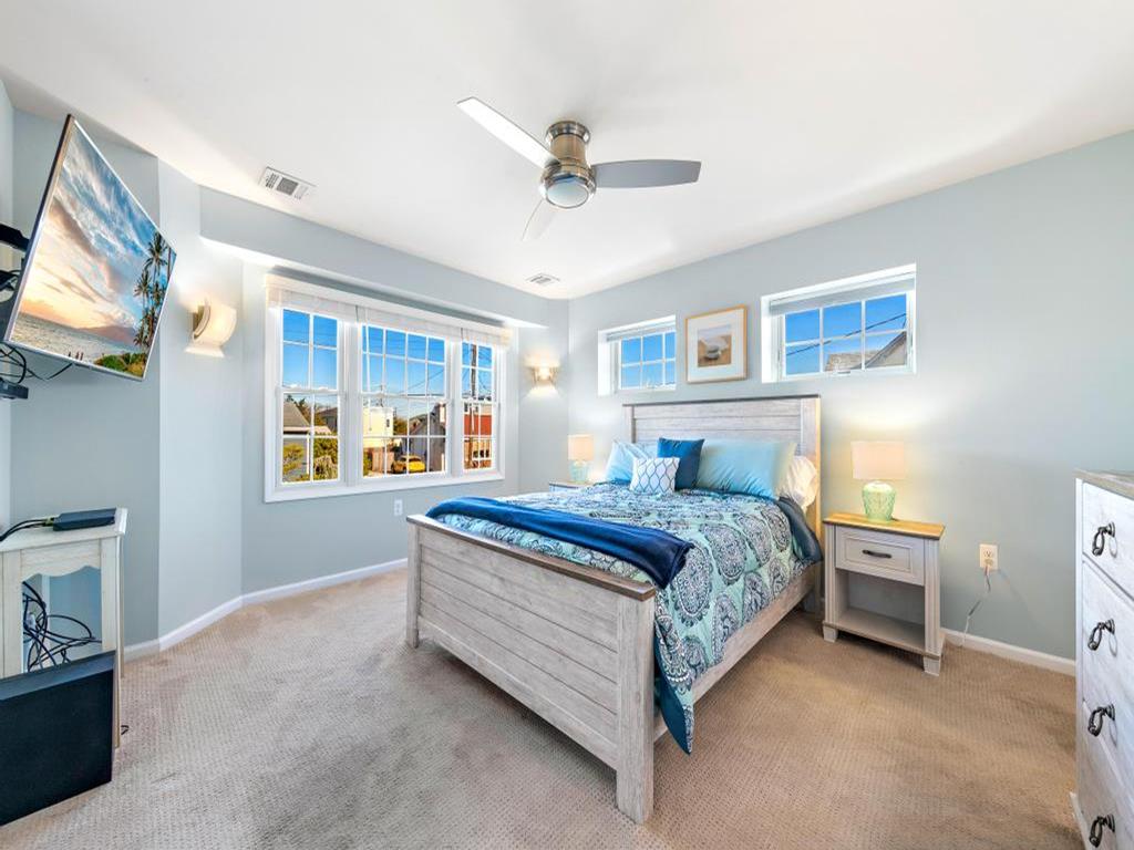 Lovely spacious 4 bedroom, 3 and a half bath contemporary non reverse living home in excellent condition, with open living room, kitchen and dining room. First floor junior master suite with kng bed and fist floor separate den with additional bed and slider to back deck and yard..Second floor king master and 2 additional large bedrooms, one with bunk and full sized bed, the other with full sized bed and full sized futon. Front and back decks to relax on and beautifully landscaped yard. And bonus huge garage turned den/rec room with ping pong, couches, TV and more. This property is new to the rental market with plenty of room for 2 families and multigenerational vacations. Exquisite landscaping, fully fenced and comfortable yard with dining and fire pit. Close the bridge, easy walk to the beach and easy on off the Island, This is a Friday to Friday rental.