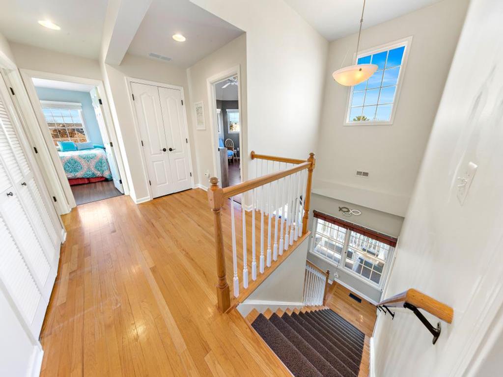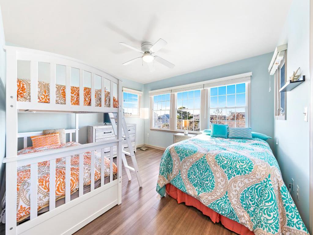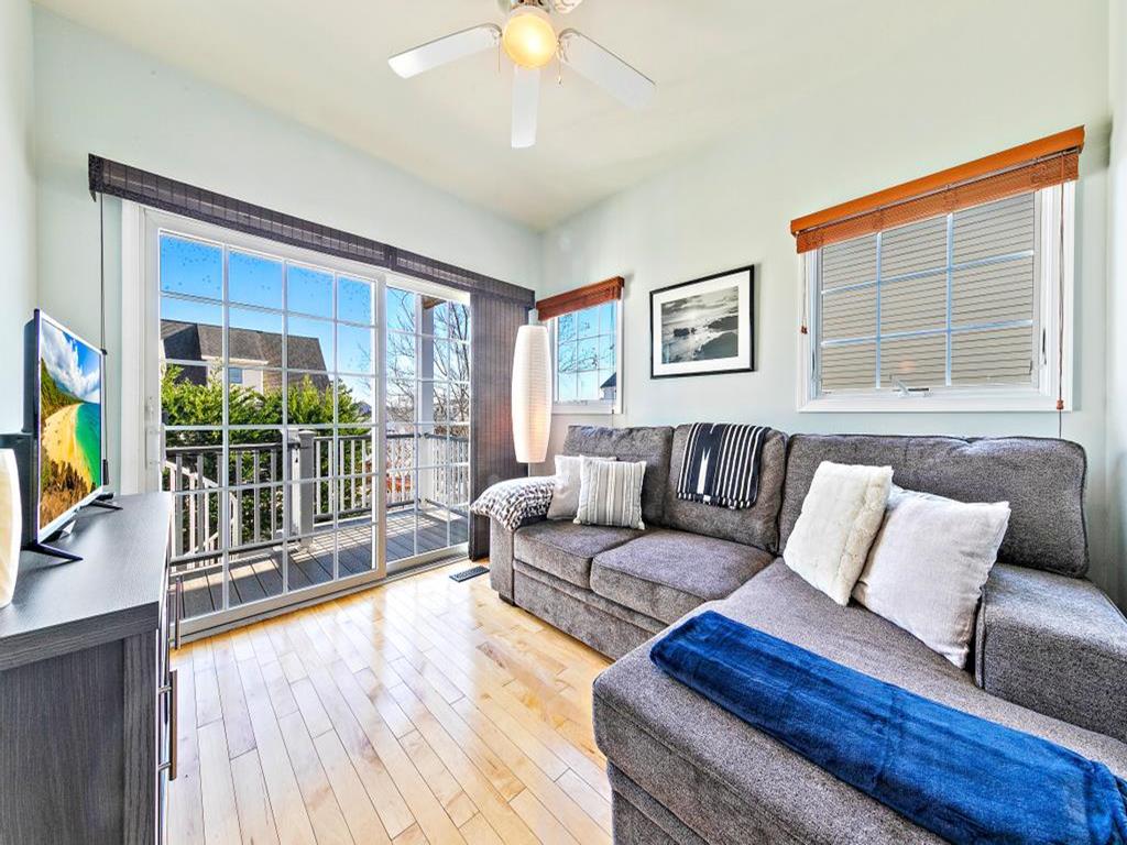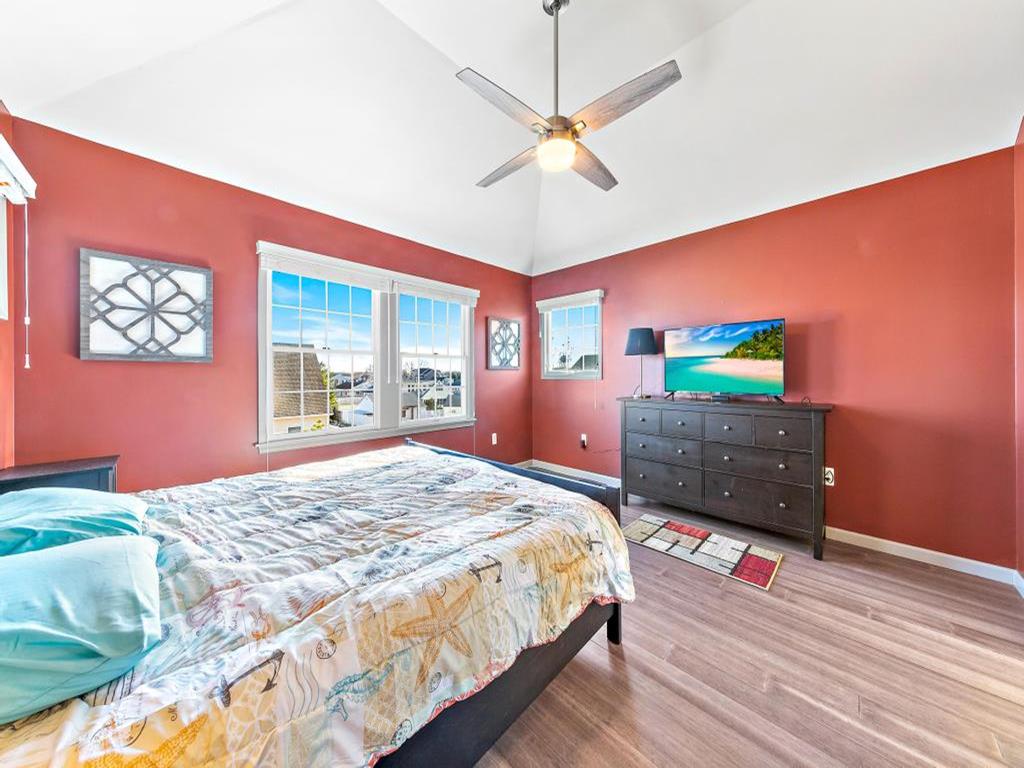 Lovely spacious 4 bedroom, 3 and a half bath contemporary non reverse living home in excellent condition, with open living room, kitchen and dining room. First floor junior master suite with kng bed and fist floor separate den with additional bed and slider to back deck and yard..Second floor king master and 2 additional large bedrooms, one with bunk and full sized bed, the other with full sized bed and full sized futon. Front and back decks to relax on and beautifully landscaped yard. And bonus huge garage turned den/rec room with ping pong, couches, TV and more. This property is new to the rental market with plenty of room for 2 families and multigenerational vacations. Exquisite landscaping, fully fenced and comfortable yard with dining and fire pit. Close the bridge, easy walk to the beach and easy on off the Island, This is a Friday to Friday rental.