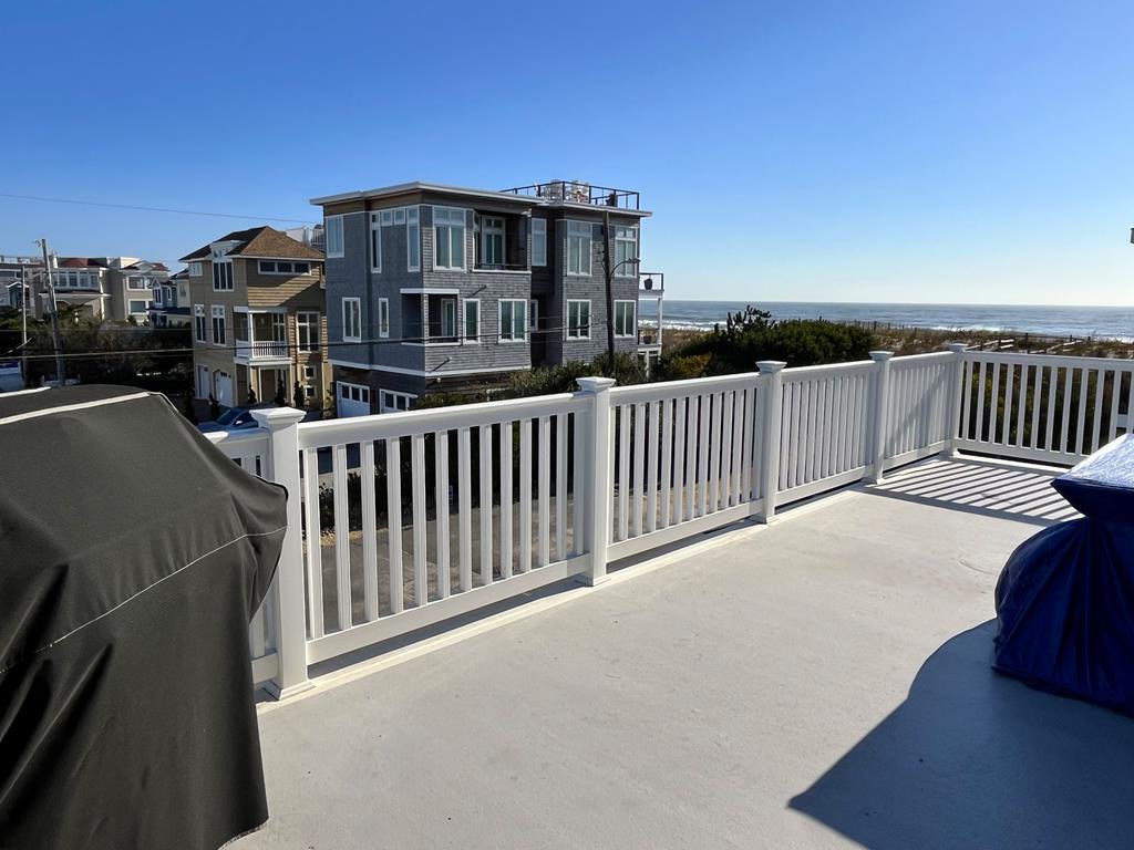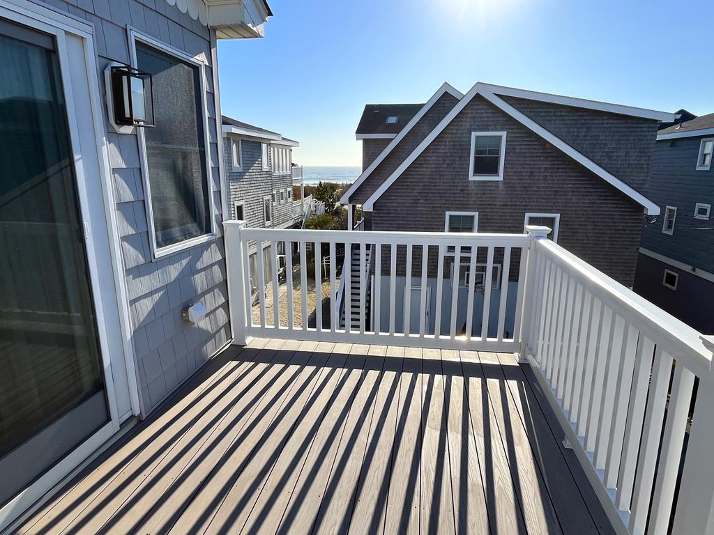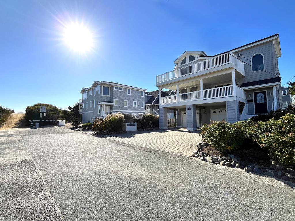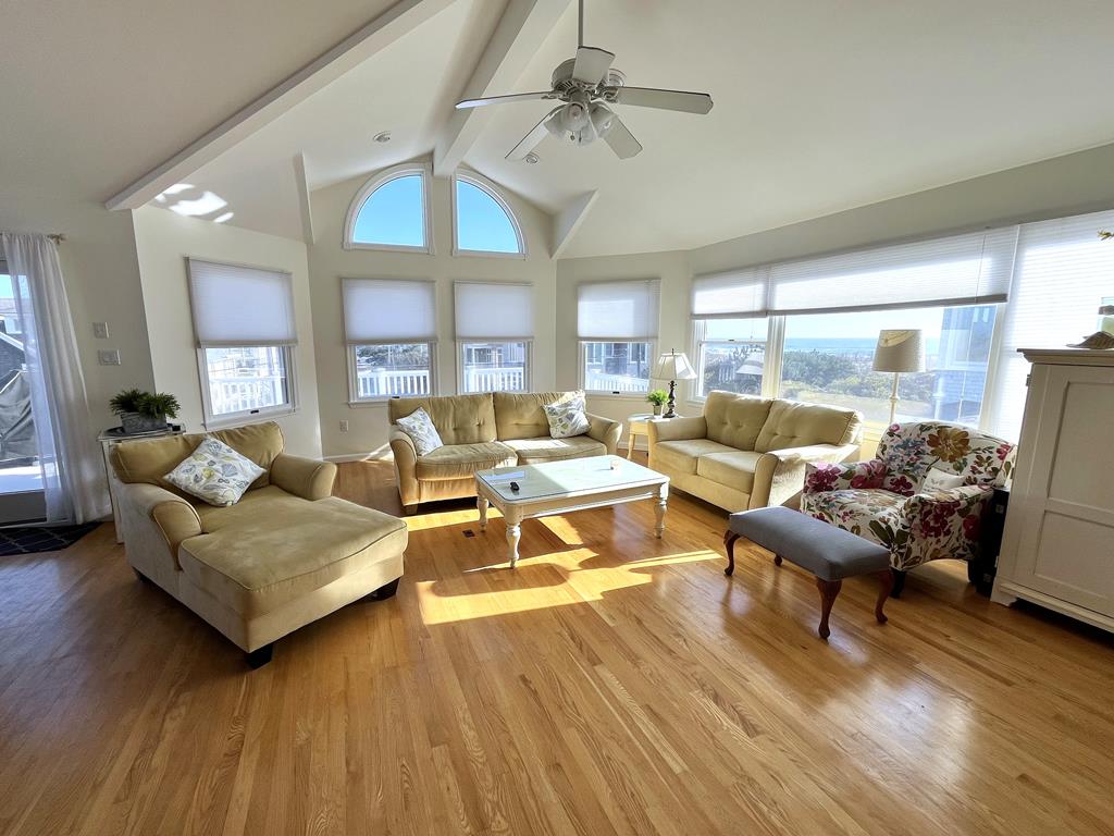 Beautiful vacation home in great location, just one away from the ocean! Enjoy awesome ocean views from both inside and out. Spacious open layout has reversed living design with living room, dining room and kitchen on upper level plus a master suite with private bath and deck with view. Lower level has 3 additional spacious bedrooms including a 2nd master suite with private bath, add\'l bath, 2nd living room and covered deck. Head up to the roof deck for great views of both sunrise and sunset. Large backyard and 2 car garage. Convenient location, easy walk to shops and restaurants.