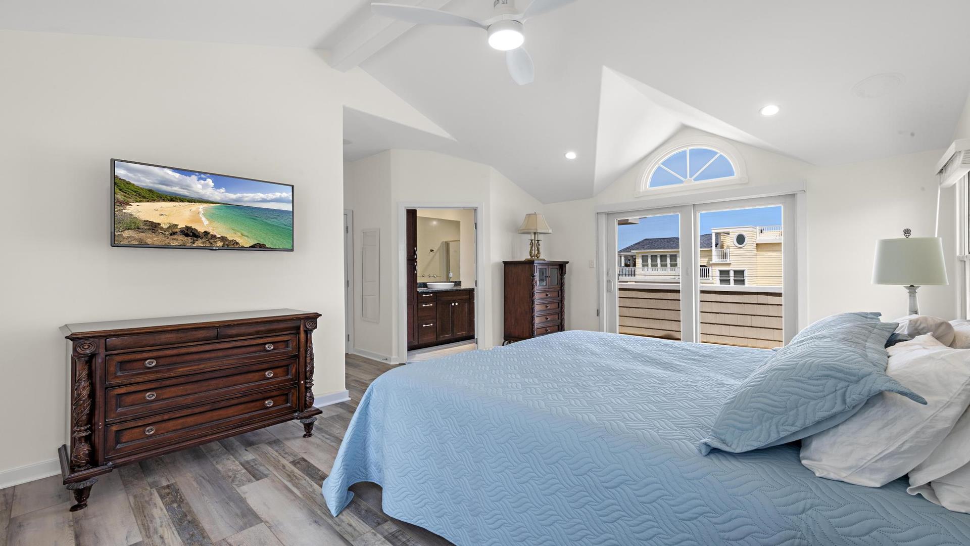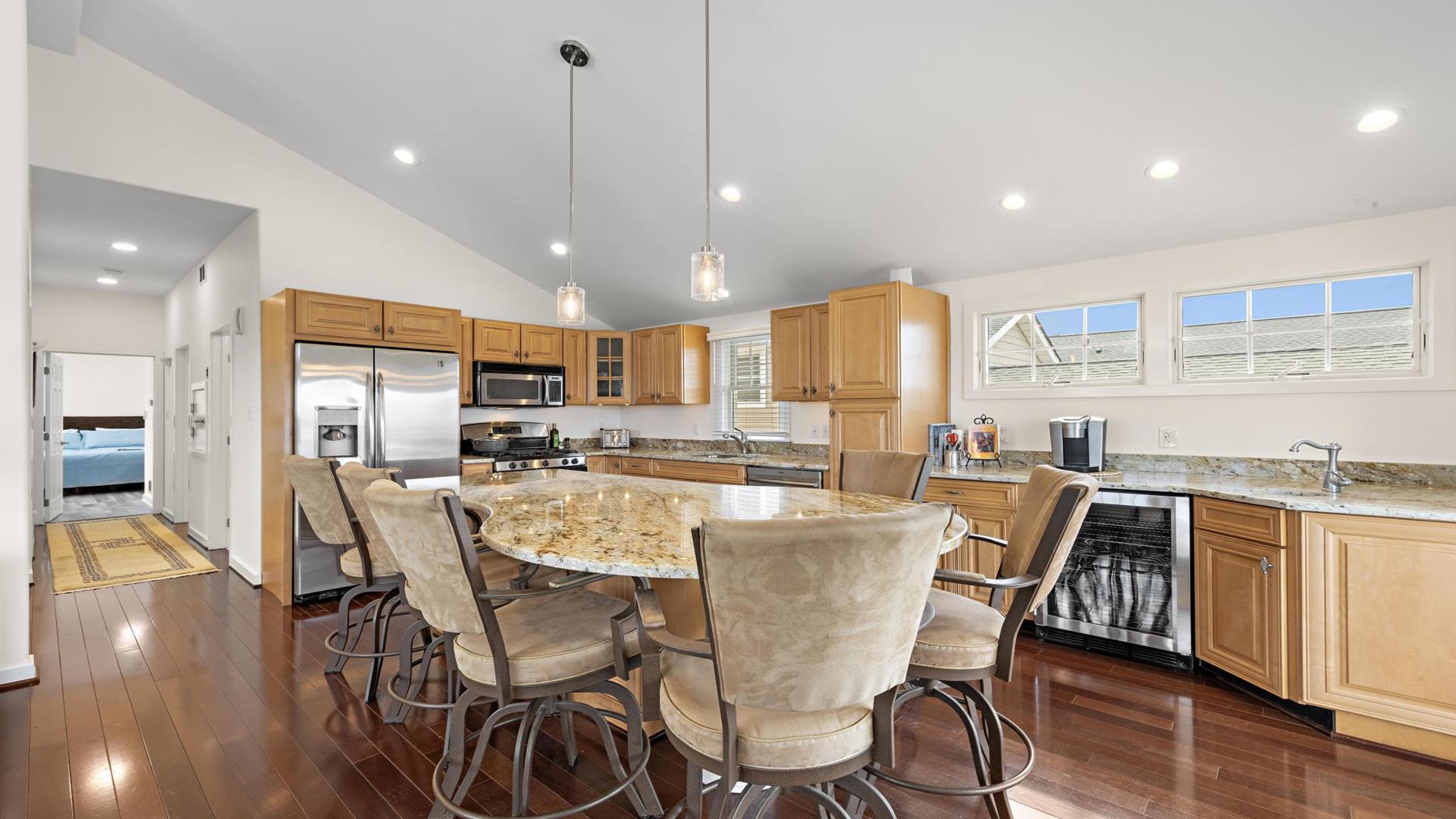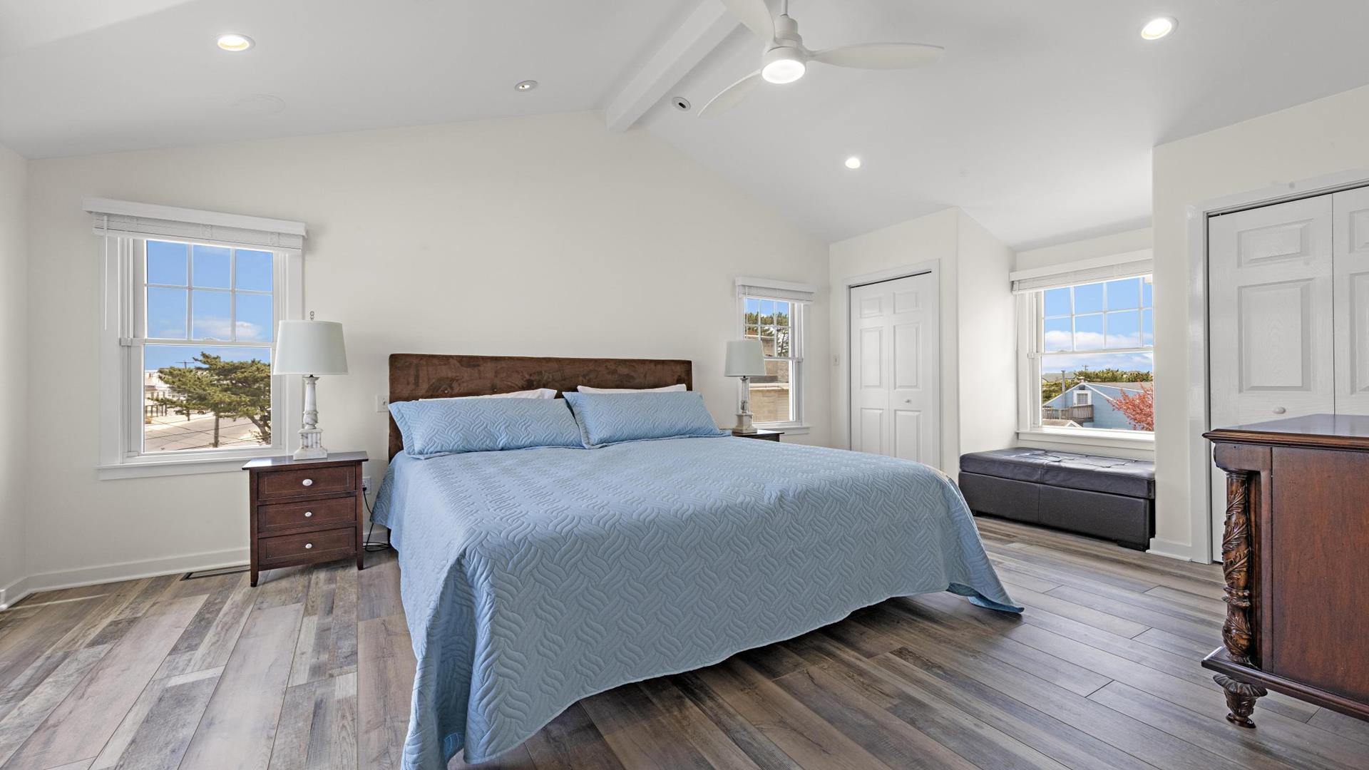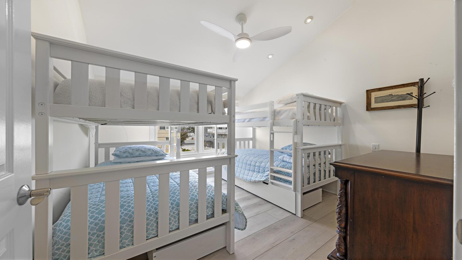 Welcome to your dream vacation rental in the heart of Beach Haven! This stunning 2nd floor unit of a Duplex has been updated and includes 3 bedroom 2 full baths perfect for families or groups of up to 8 people. Located on the Bay Side, this home is just a short walk to the beach access. Step inside and you\'ll find a beautifully furnished interior with all the amenities you need for a comfortable stay. The primary bedroom and ensuite features a luxurious California King, while bedroom 2 provides a comfortable queen . Bedroom 3 is a bunk room with 2 sets of bunk beds (4 twins) for the kiddos. The fully equipped kitchen comes with a dishwasher, microwave, toaster, blender, stove, full-size refrigerator, oven, and all the cooking utensils you need to whip up delicious meals during your stay. Relax in the spacious living room with central AC, ceiling fans, and 2 TVs for entertainment. Enjoy meals at the dining table or head outside for el fresco dining on the deck with gas grill.. Head up to the roof top deck and sip on a drink as the sun goes down. The level yard and private yard provide plenty of space for outdoor activities, and beach equipment is available for your convenience. This property offers high-speed internet, a garage, parking for 4 vehicles, and beach badges for 8 guests. Enjoy the convenience of a washer, dryer, iron, vacuum cleaner, and all the cleaning supplies you need. The rooftop deck offers stunning views of the surrounding area, and the enclosed outside shower is perfect for rinsing off after a day at the beach. This property is pet-free and smoke-free, ensuring a clean and healthy environment for all guests. Don\'t miss out on this amazing vacation rental in Beach Haven! Book now and experience the best that the Jersey Shore has to offer.