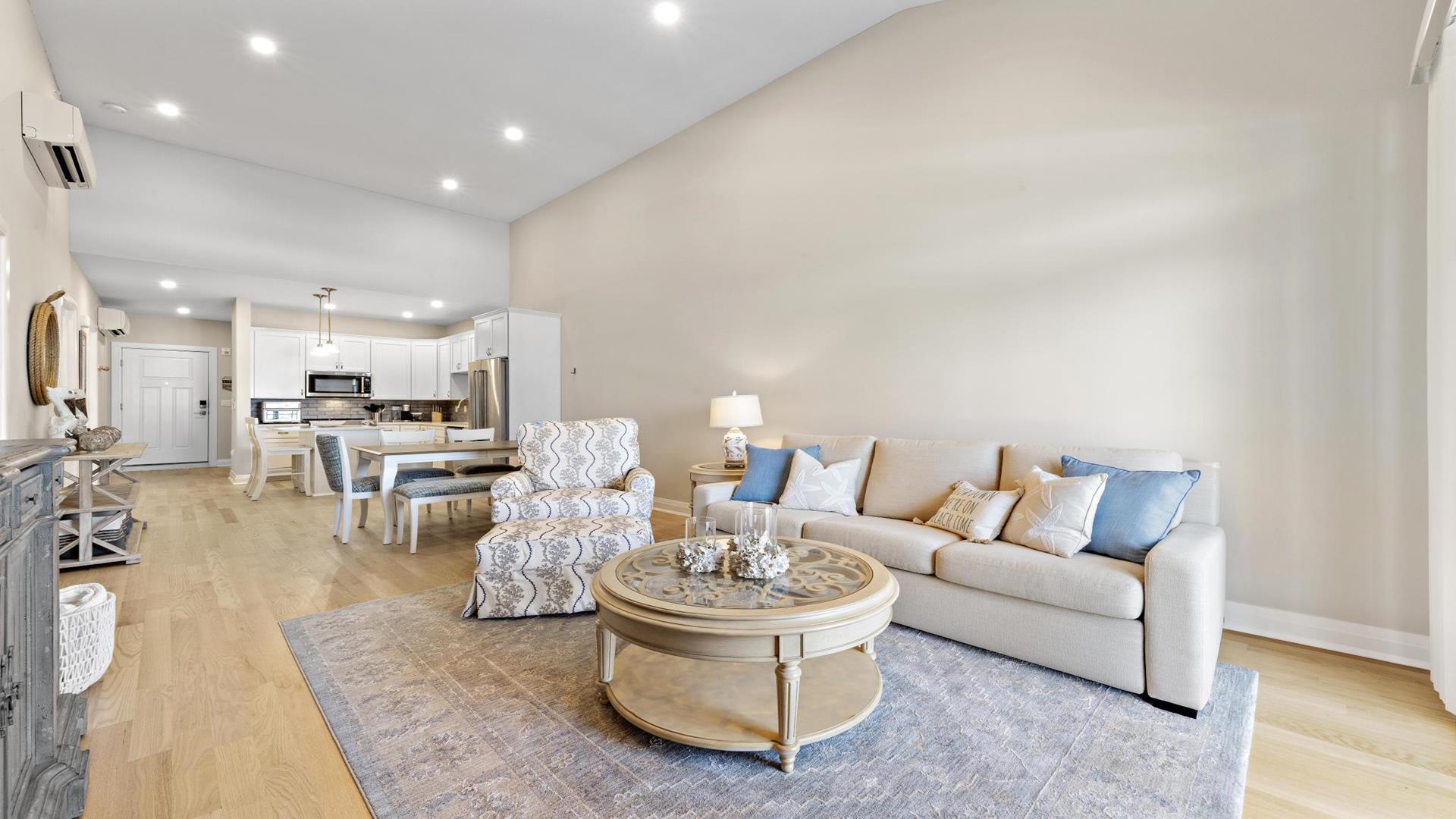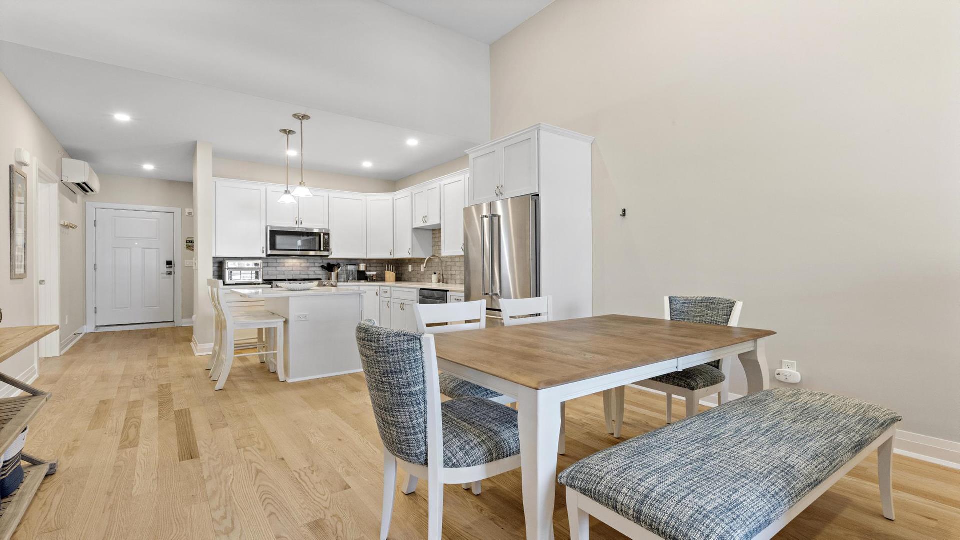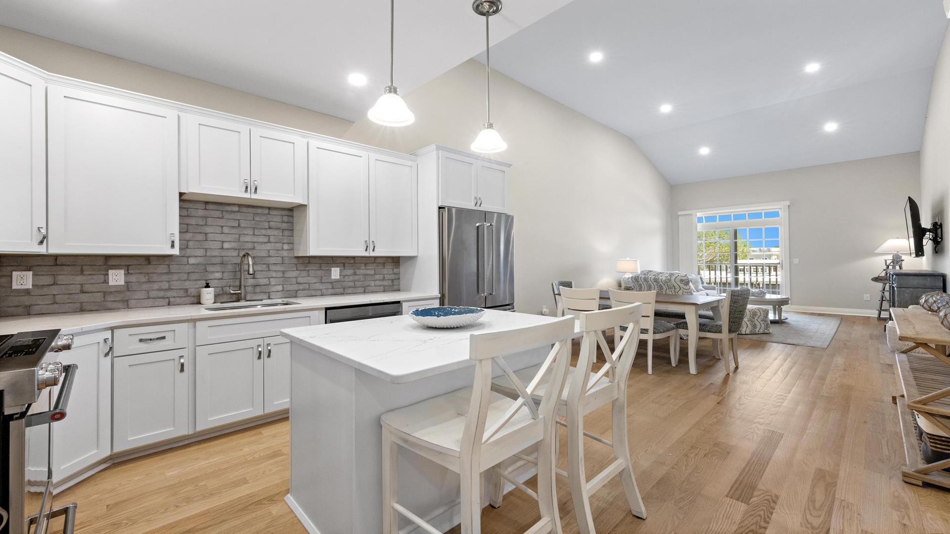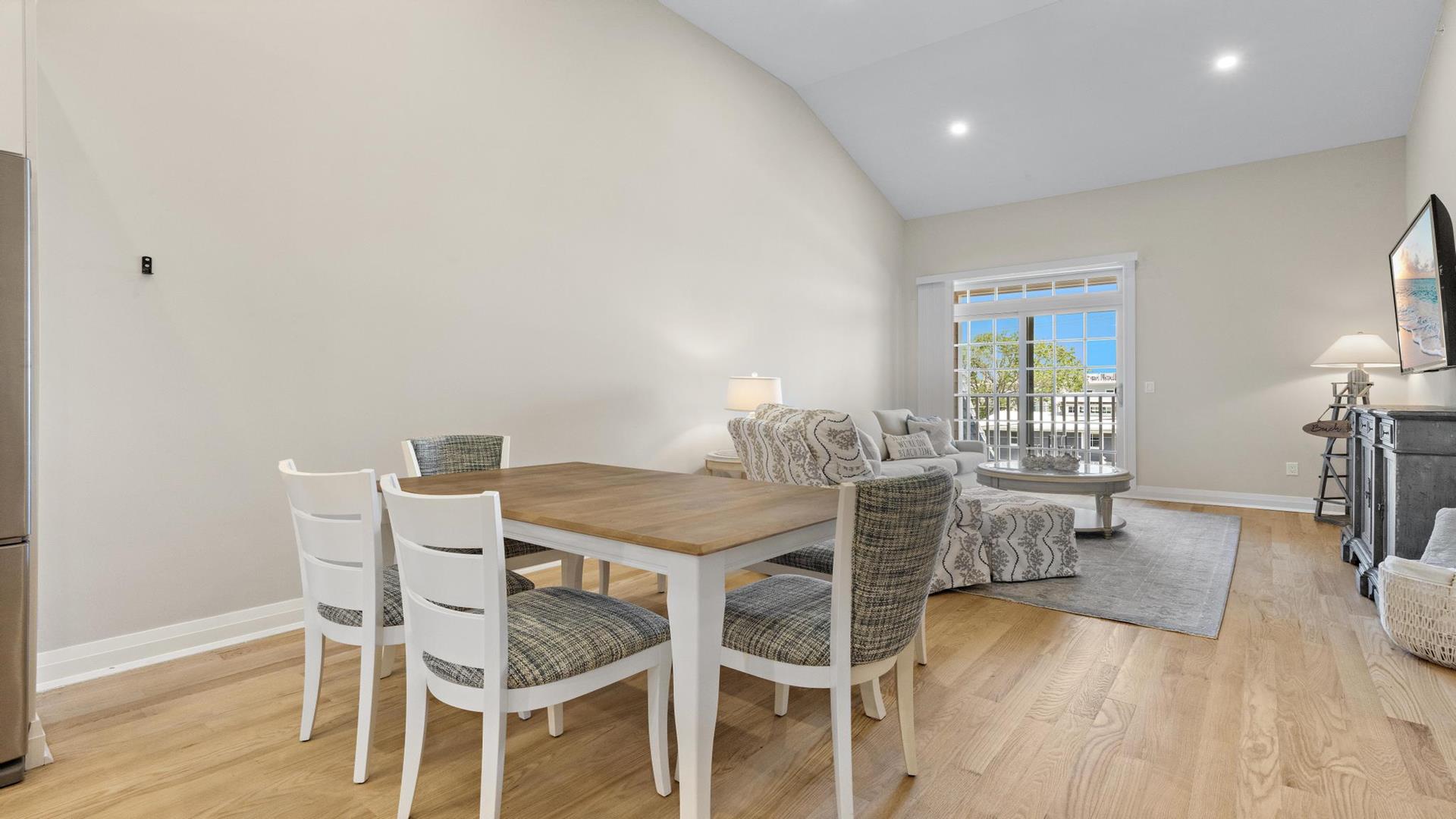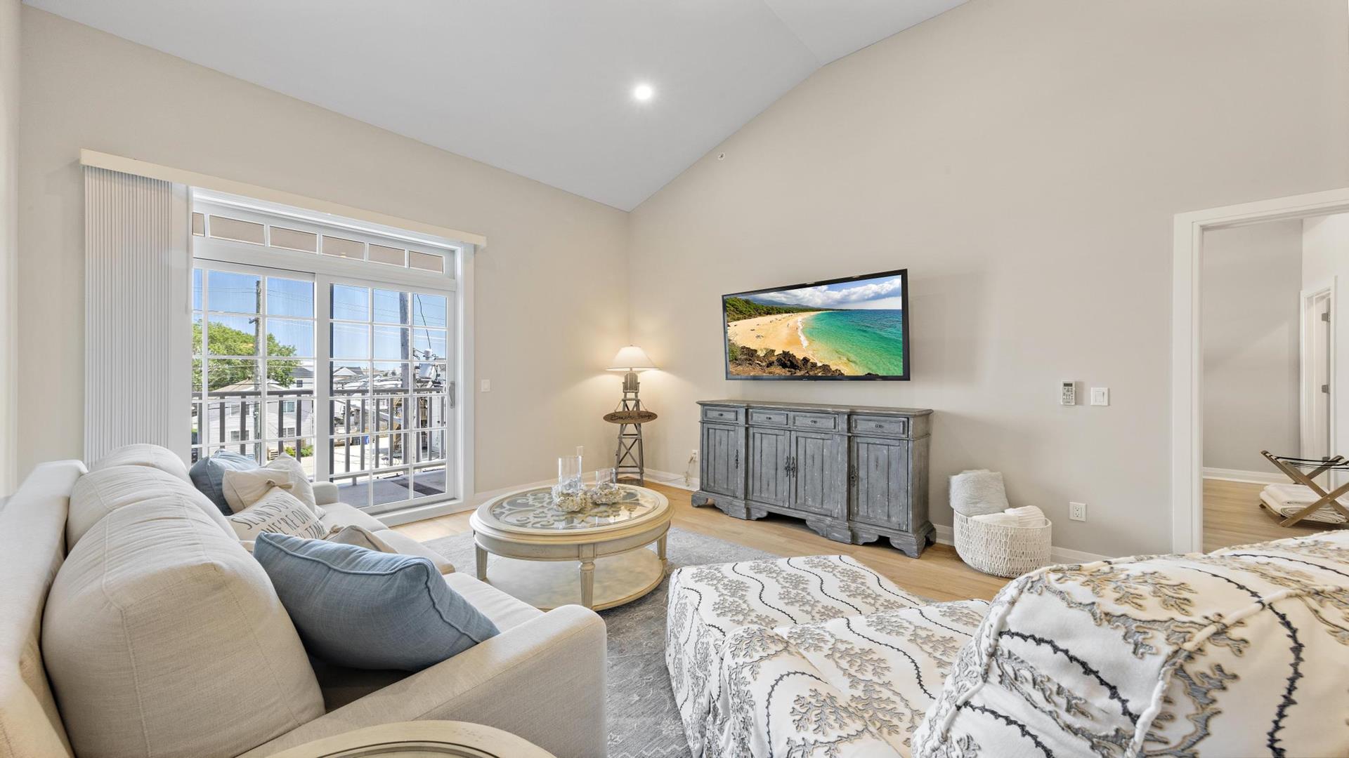 Welcome to your perfect beach getaway in Beach Haven! This beautiful, 2-bedroom, and 2-full bathroom condo property located on the Bay Side is ideal for a group of up to 7 people and walking distance to all Beach Haven has to offer. As you step inside, you\'ll find a comfortable open concept living room and kitchen.The fully-equipped kitchen features modern appliances, including a dishwasher, microwave, convection oven, Keurig coffee maker, and a kitchen island perfect for preparing family meals. Primary bedroom includes a king mattress and ensuite,. The second bedroom has a full over full bunk that can sleep 4 and there is a King sofa bed in the living room. Additional amenities such as a portable crib, high-speed internet, and smart TVs throughout the property will ensure your stay is as convenient as it is enjoyable. Step outside onto the deck or balcony to enjoy the fresh sea breeze or go up to the roof top deck and gather around the outdoor firepit for cozy evenings under the stars. The rooftop deck offers panoramic views of the surrounding area, while the association pool is perfect for a refreshing dip on sunny days. For your convenience, this property comes fully furnished with beach equipment, baby equipment, and all the essentials you need for a comfortable stay. Just bring your own linens, and you\'re all set to enjoy a relaxing vacation by the beach. With amenities like an elevator, garage parking for 2 cars, beach badges, and access to a shared outside shower, this property has everything you need for a stress-free vacation. And rest assured, it is pet-free and smoke-free for a clean and safe environment. Don\'t miss out on the opportunity to stay in this beautifully appointed rental property in Beach Haven. Book now and create unforgettable memories with your loved ones in this coastal paradise!