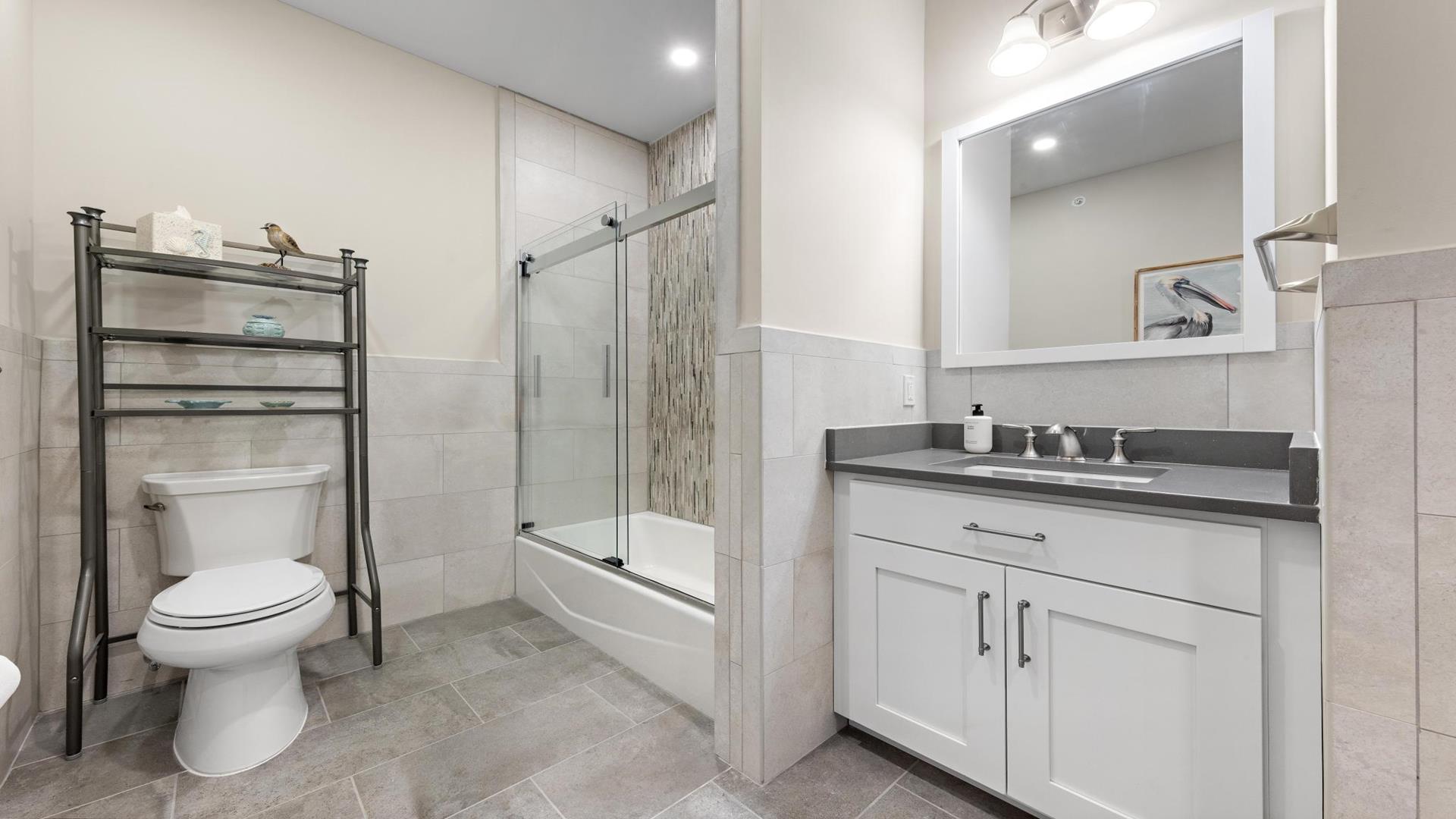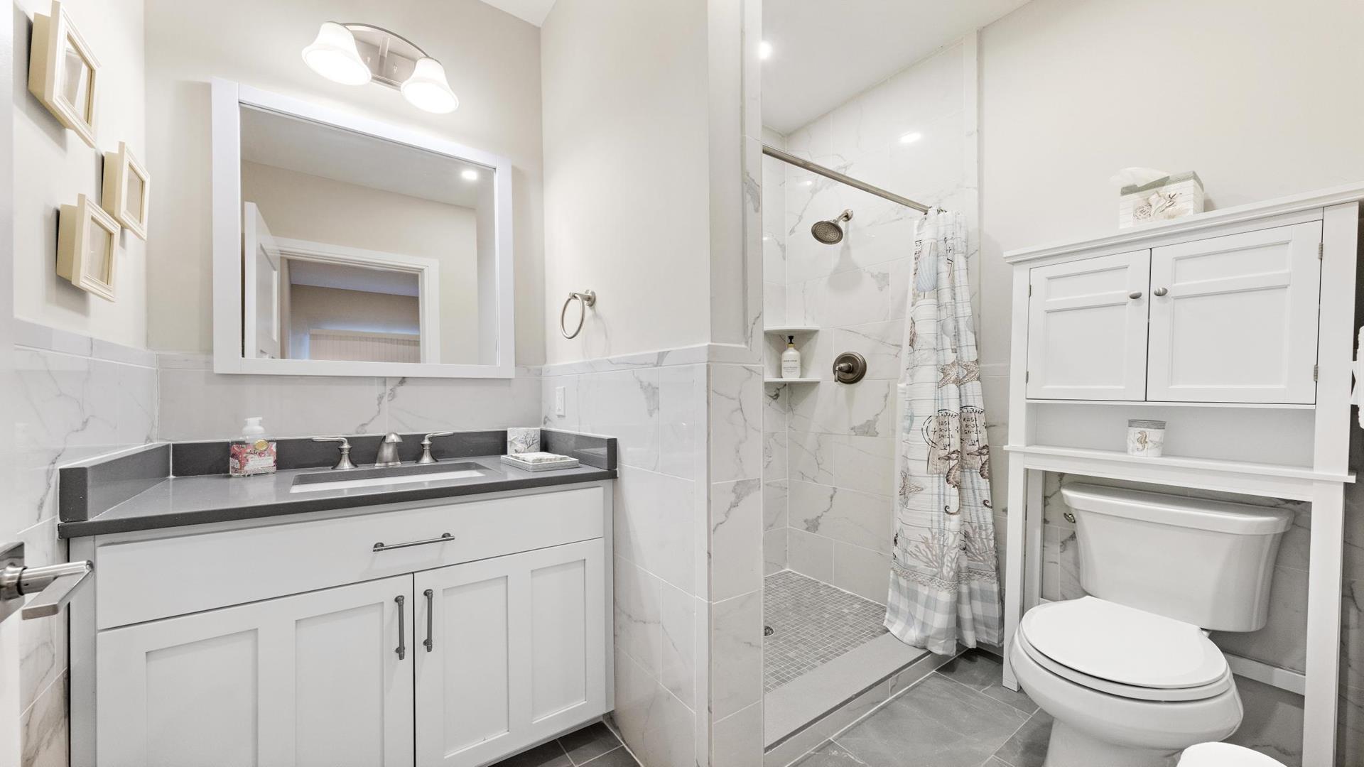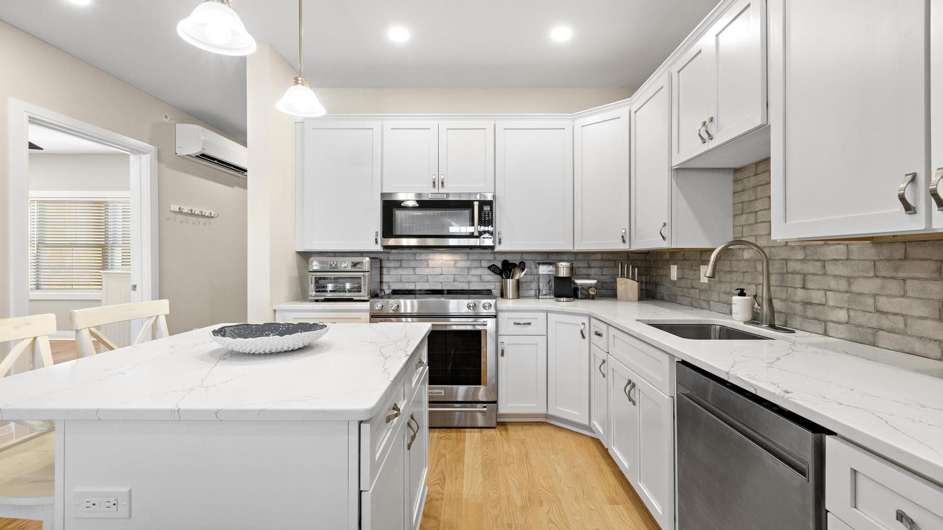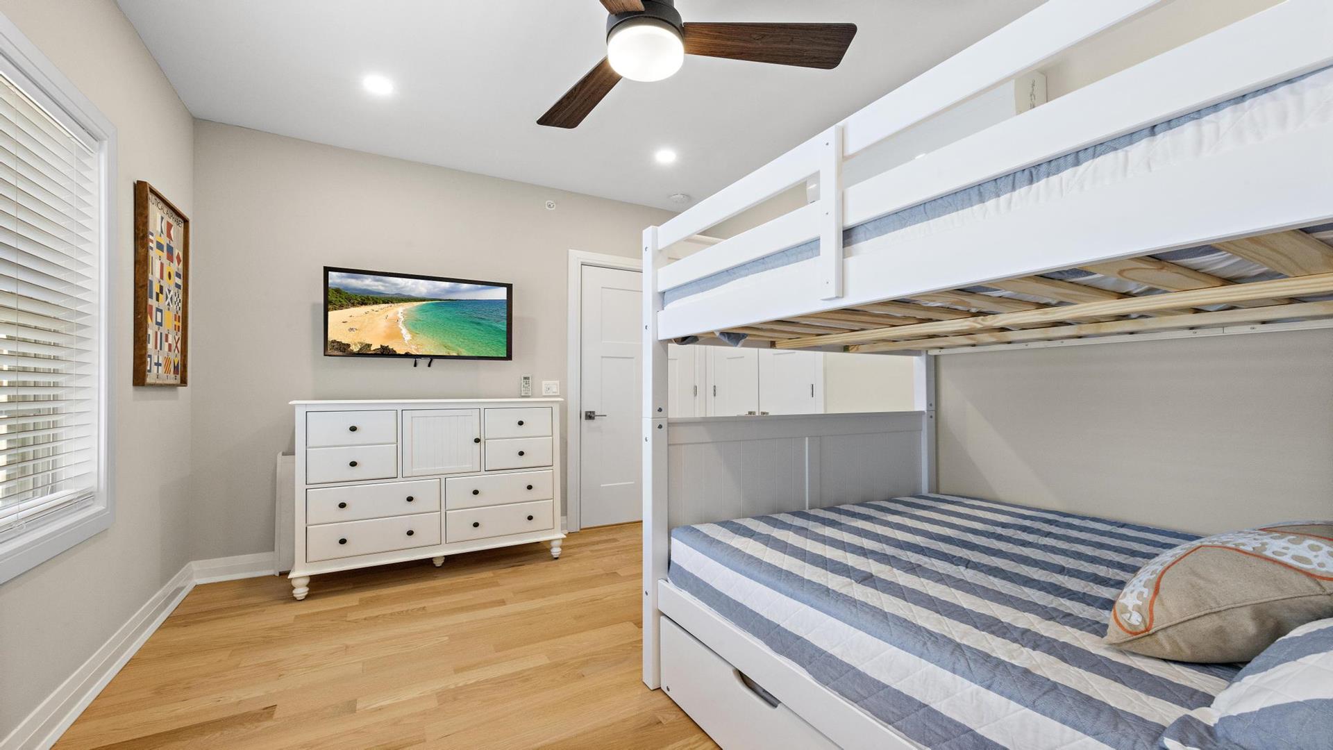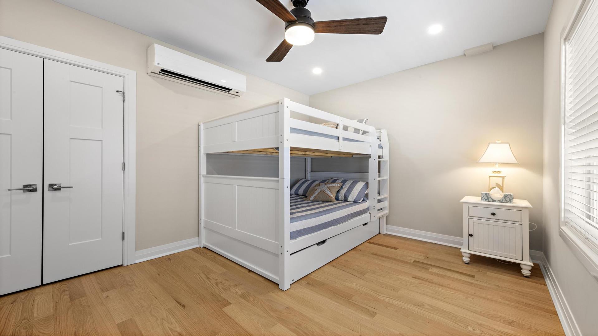 Welcome to your perfect beach getaway in Beach Haven! This beautiful, 2-bedroom, and 2-full bathroom condo property located on the Bay Side is ideal for a group of up to 7 people and walking distance to all Beach Haven has to offer. As you step inside, you\'ll find a comfortable open concept living room and kitchen.The fully-equipped kitchen features modern appliances, including a dishwasher, microwave, convection oven, Keurig coffee maker, and a kitchen island perfect for preparing family meals. Primary bedroom includes a king mattress and ensuite,. The second bedroom has a full over full bunk that can sleep 4 and there is a King sofa bed in the living room. Additional amenities such as a portable crib, high-speed internet, and smart TVs throughout the property will ensure your stay is as convenient as it is enjoyable. Step outside onto the deck or balcony to enjoy the fresh sea breeze or go up to the roof top deck and gather around the outdoor firepit for cozy evenings under the stars. The rooftop deck offers panoramic views of the surrounding area, while the association pool is perfect for a refreshing dip on sunny days. For your convenience, this property comes fully furnished with beach equipment, baby equipment, and all the essentials you need for a comfortable stay. Just bring your own linens, and you\'re all set to enjoy a relaxing vacation by the beach. With amenities like an elevator, garage parking for 2 cars, beach badges, and access to a shared outside shower, this property has everything you need for a stress-free vacation. And rest assured, it is pet-free and smoke-free for a clean and safe environment. Don\'t miss out on the opportunity to stay in this beautifully appointed rental property in Beach Haven. Book now and create unforgettable memories with your loved ones in this coastal paradise!
