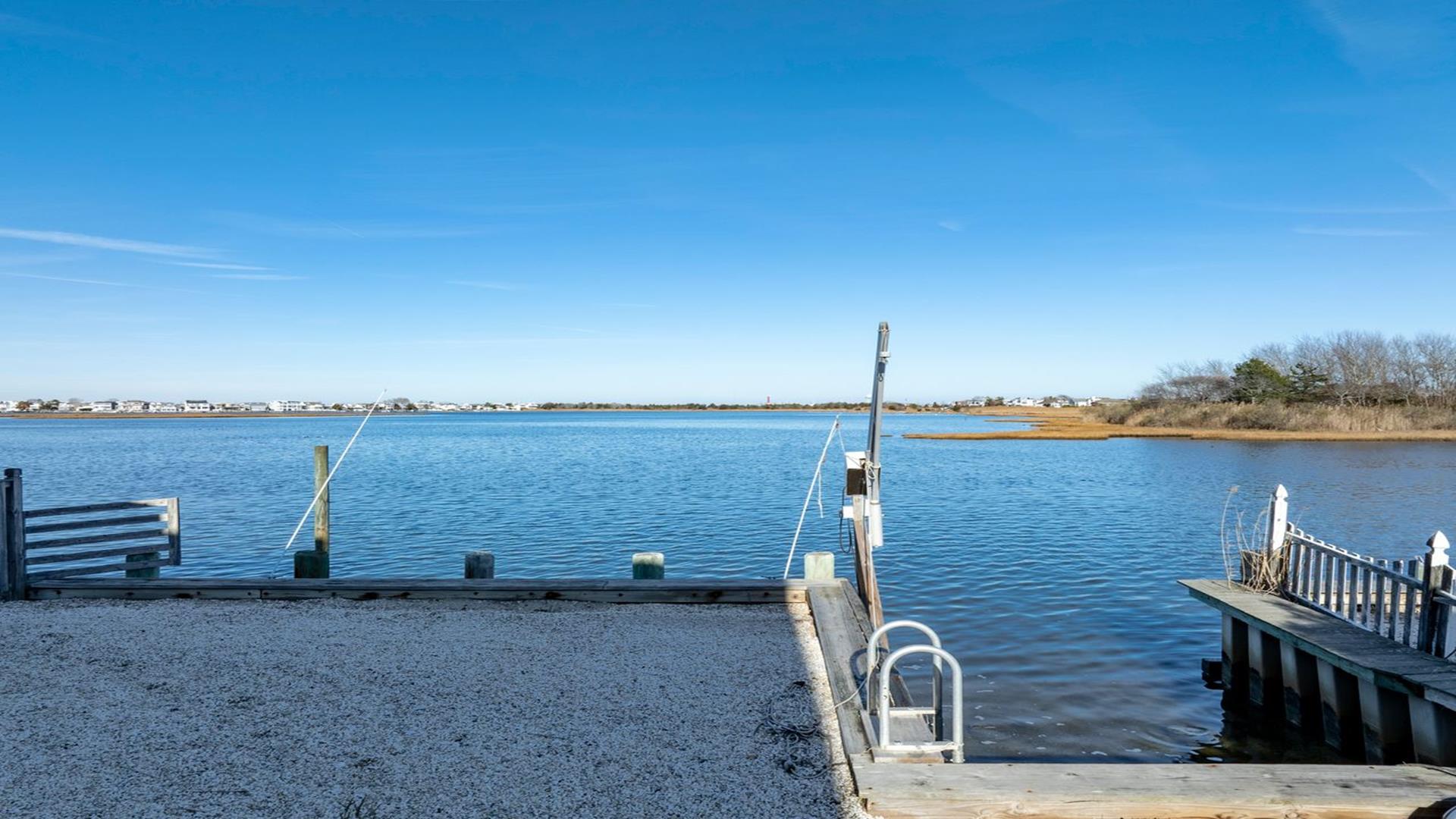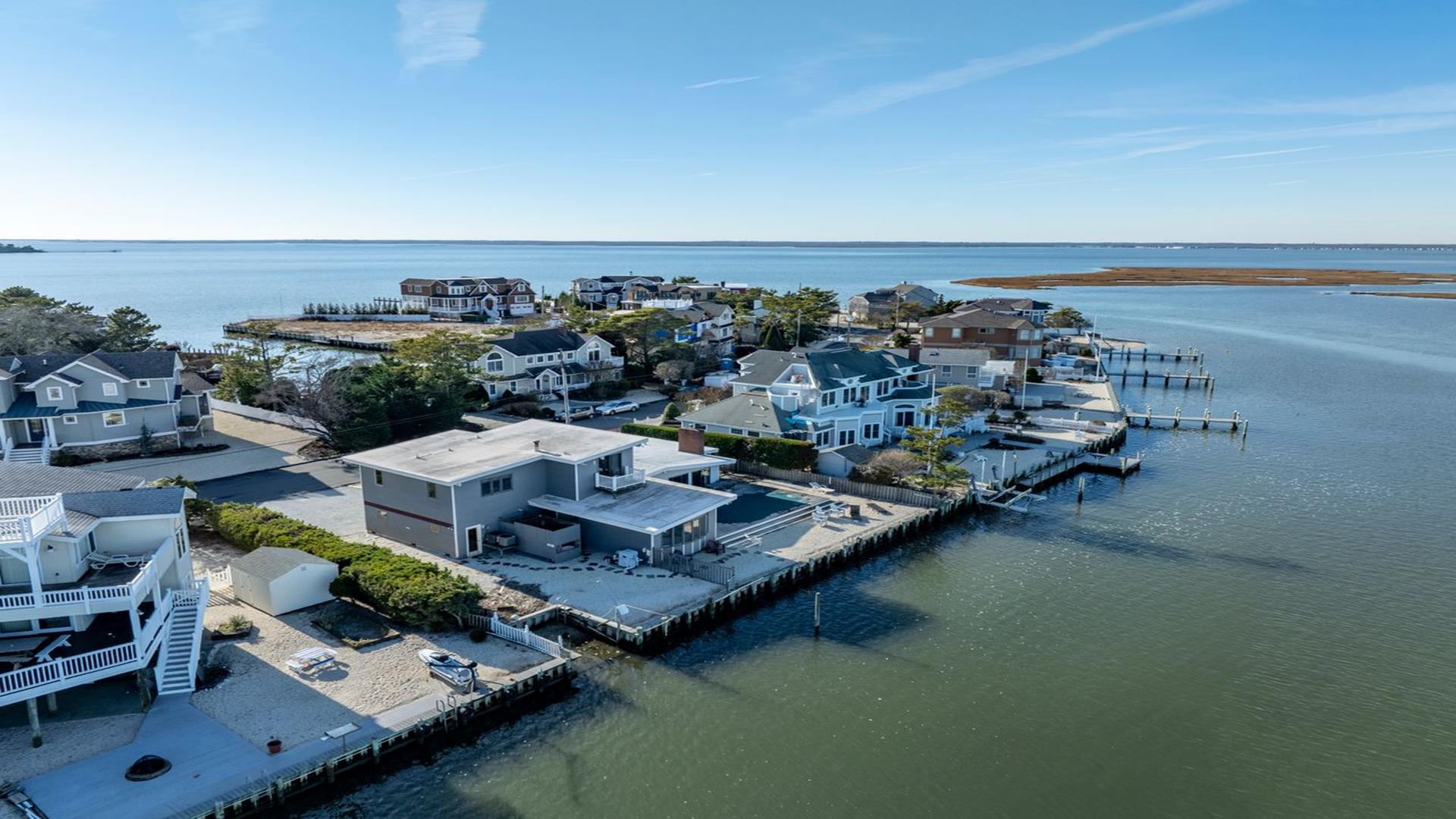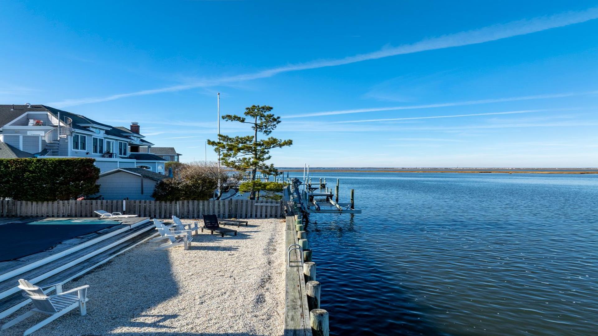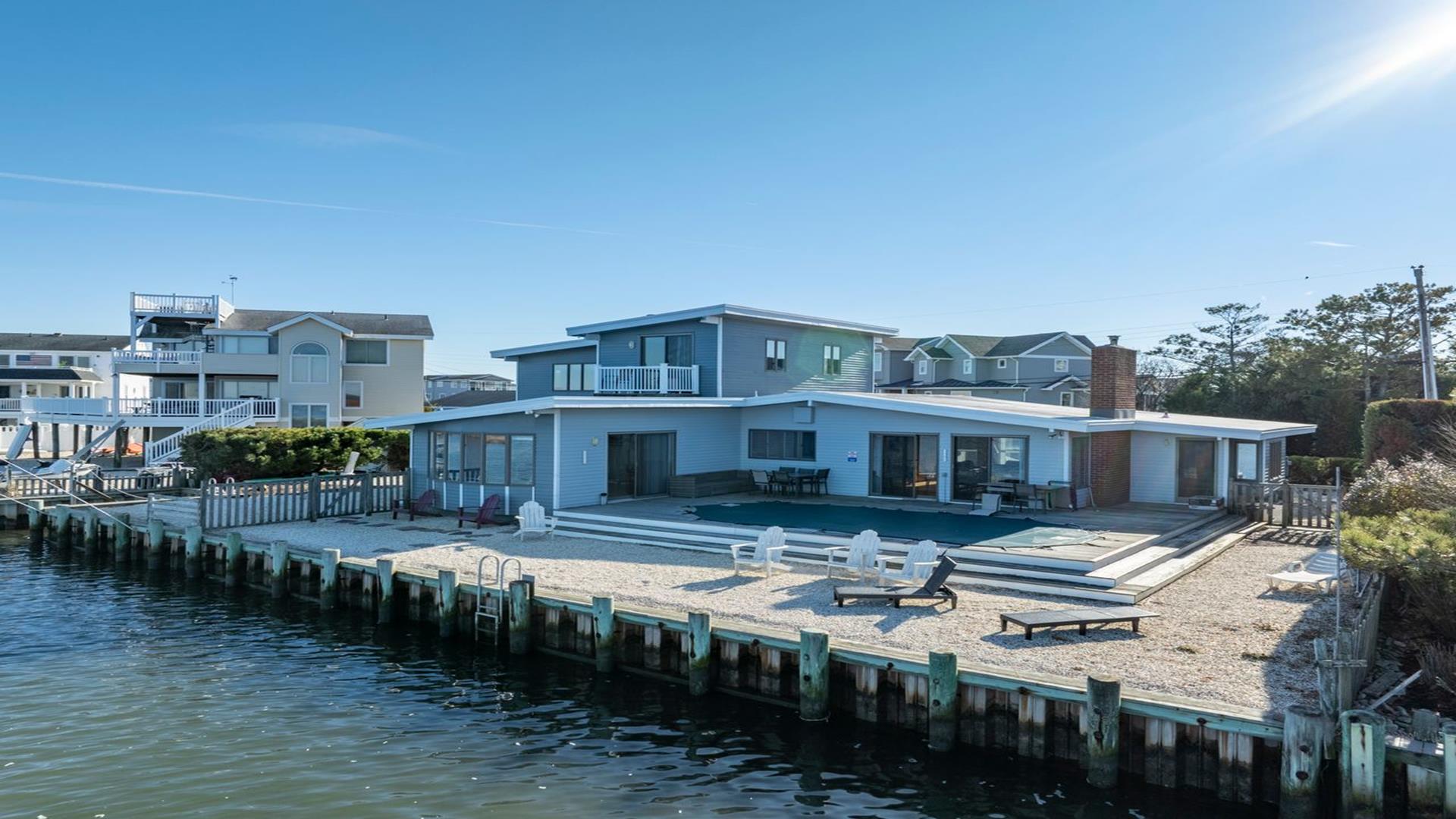 Enjoy and relax in this wonderful five bedroom, bayfront home on a quiet residential street in Loveladies with an amazing unobstructed view of the Barnegat Lighthouse. The perfect home for a multigenerational family vacation! Designed with accessibility in mind, the home may be entered via the front door or the handicap accessible ramp which is located in the garage. The first floor includes a large and bright open concept kitchen/living room/dining room area with slider doors that lead out to the expansive waterfront deck. There is also a hall roll in handicap accessible full bathroom and two generously sized bedrooms which boast fantastic bayfront views:Outside is a new private salt water heated pool, gas grill, comfortable patio furniture and an outdoor shower. There is a swimming ladder for use to access the bay during the summer. The life-guarded 30th Street Barnegat Light ocean beach is a short five-minute walk away. Or take your little ones to a nearby calm, fenced and guarded children\'s bay beach.